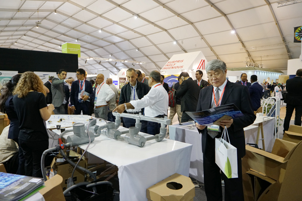 ??? 11月8日上午,在摩中商會(huì )、摩洛哥外貿銀行、香港匯盛資本等機構負責人的陪同下,紀勤應總經(jīng)理一行參觀(guān)了聯(lián)合氣候大會(huì )主展館。展會(huì )現場(chǎng)來(lái)自世界各地節能環(huán)保產(chǎn)業(yè)技術(shù)展示、部分獨具匠心的展臺設計展現出的世界各國實(shí)現綠色循環(huán)低碳發(fā)展,推進(jìn)清潔能源、可再生資源,應對氣候變化、追求美好未來(lái)的決心等給考察團一行留下了深刻的印象。